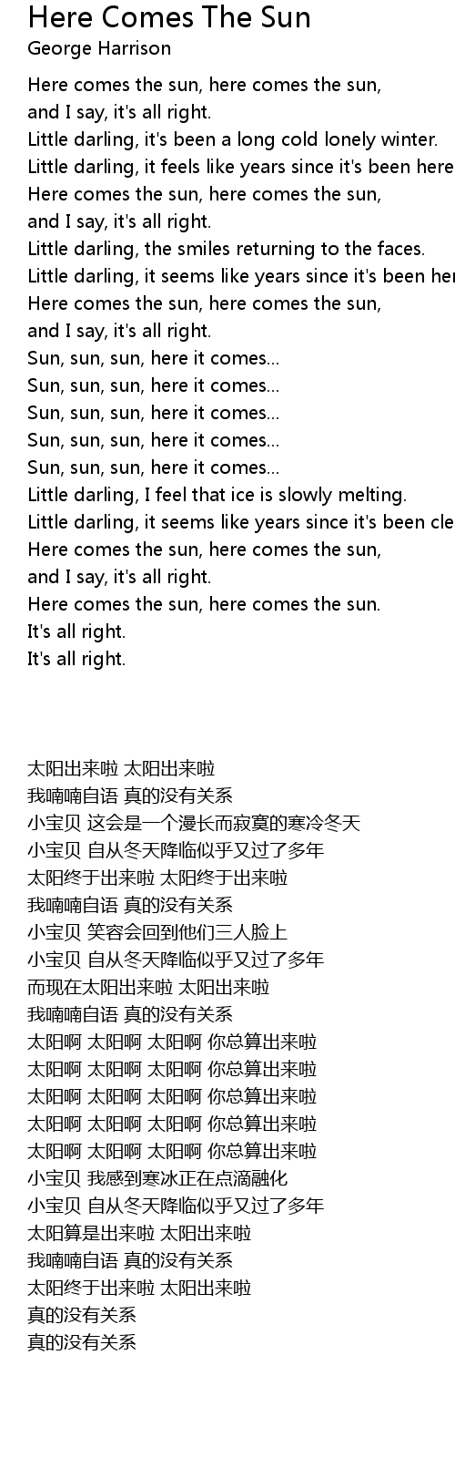 The Beatles - Here Comes The Sun Here comes the sun (doo doo doo doo) Here comes the sun, and I say It's all right Little . Little Darling Here Comes The Sun Lyrics are a subject that is being searched for and appreciated by netizens now. You can Download the Little Darling Here Comes The Sun Lyrics here. Download all royalty-free images. Here Comes The Sun - The Beatles (Lyrics), Here Comes The Sun - The Beatles (Lyrics) Choose Your Favorite Artist Here: http://bit.ly/MyFavoriteArtist Stay tuned for brand .